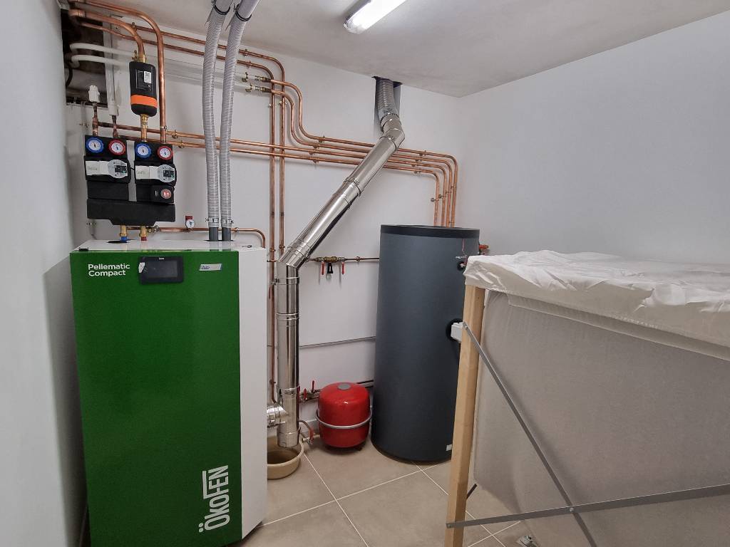 Une fois cette étape réalisée, nous avons installé une chaudière à granulés de bois ÖKOFEN modèle PELLEMATIC COMPACT zéro flamme.
